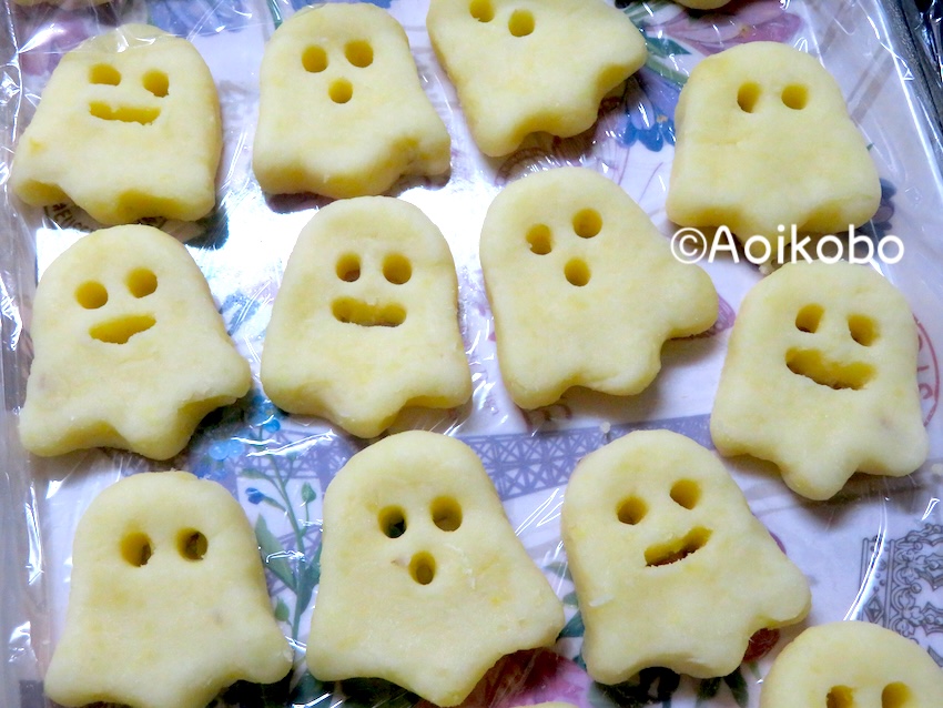 おばけ型にして焼いたら可愛いのでは…?と、マッシュしたじゃがいもに塩や片栗粉、牛乳、水などをいい感じに加えて成型できる状態にし、粘土細工よろしく捏ねておばけ型にしました。