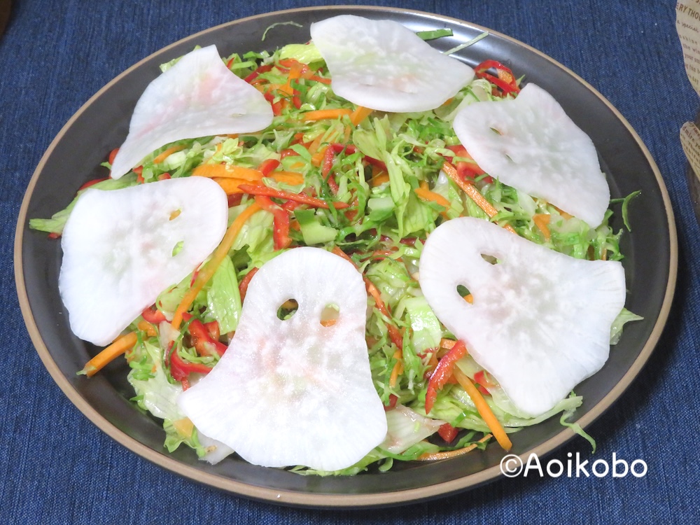 普段食べているサラダに先述の飾り切りおばけを並べて乗せただけなので、特筆すべきことはないのですが、それだけで一気にハロウィン感が出るので手軽さという点においては大変おすすめです。