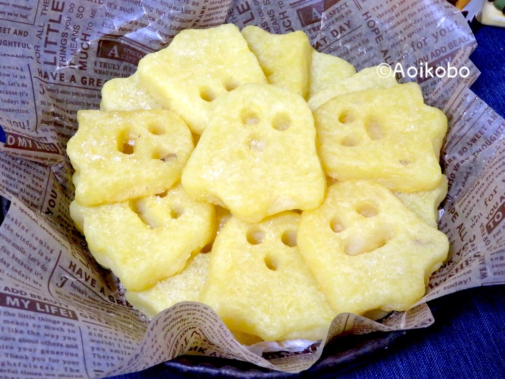 調べていると、おばけは餃子の皮やチーズなどで作っている方が多かったのですが、これだけのために買うのも違うし、かと言って小麦粉捏ねて作るのも凝りすぎだし、ということで大根で作ってみたところ大変可愛く仕上がりました。